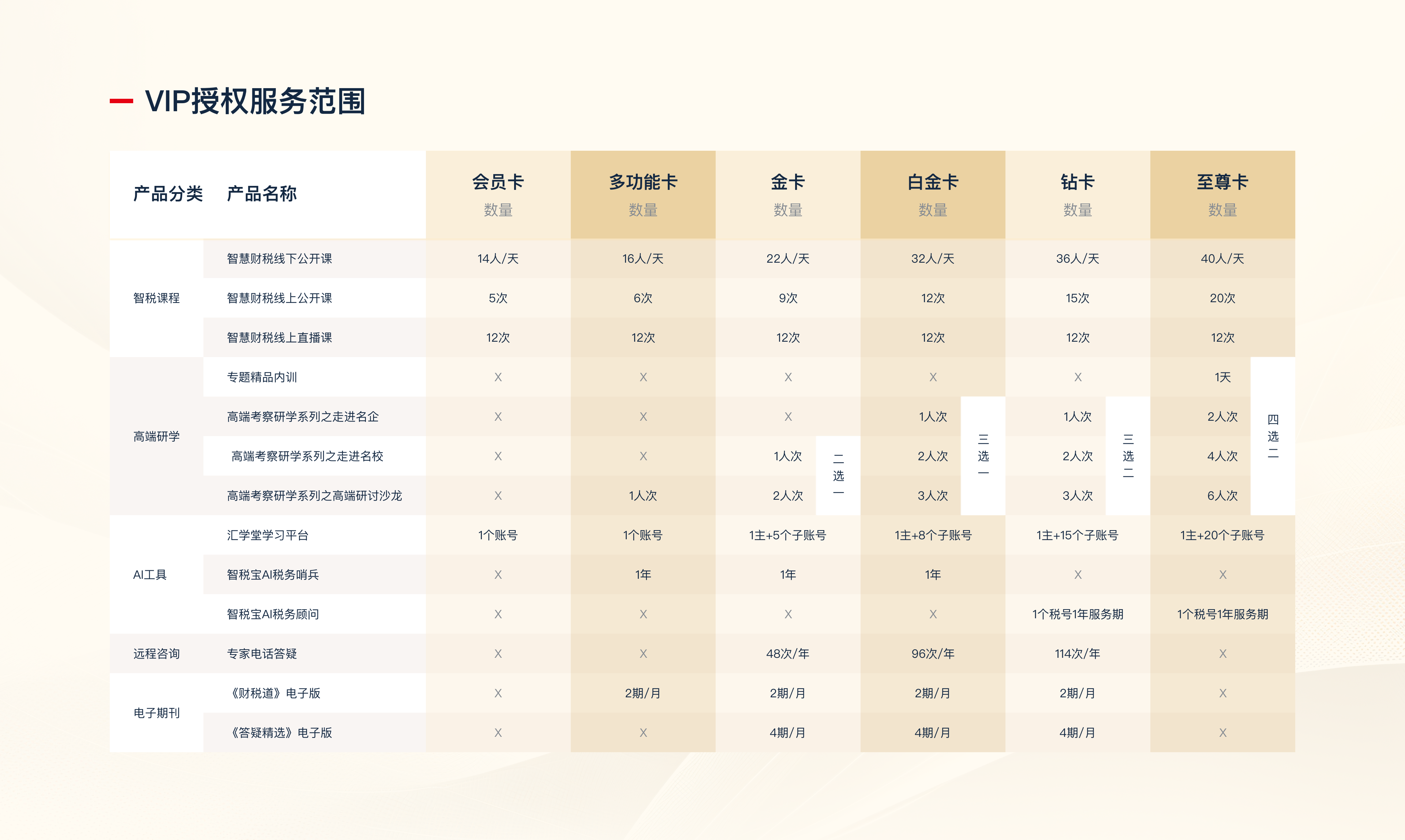 针对企业不同发展阶段的财税需求差异,会员卡整合差异化课程资源、智能工具与专家服务三重核心能力:既满足初创企业的轻量服务需求,也支撑中大型企业的深度财税管理,更适配集团客户的定制化服务场景。以体系化服务包的形式,助力企业在各发展阶段高效解决财税难题、提升管理效率,是企业稳健发展的财税长期伙伴。